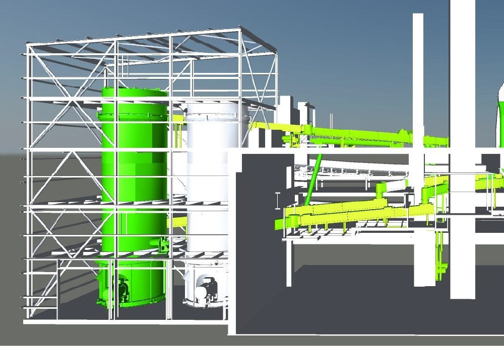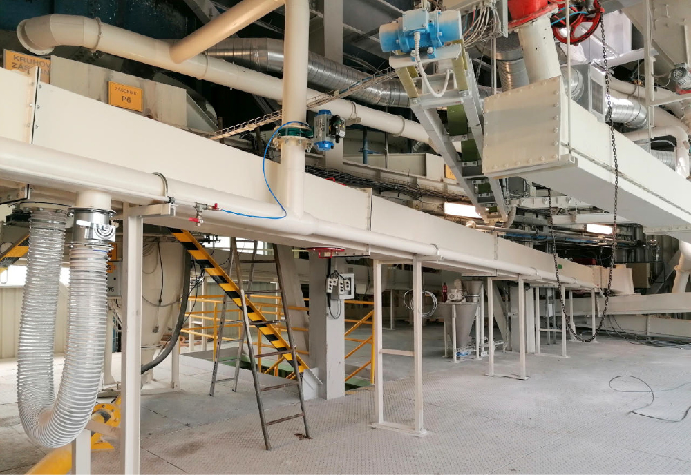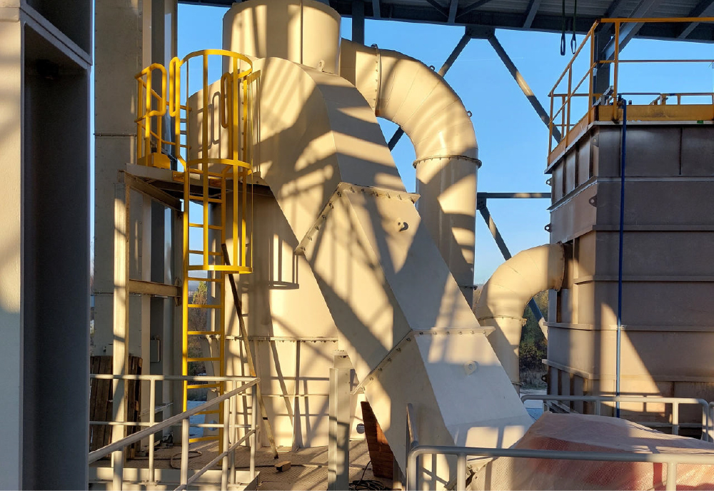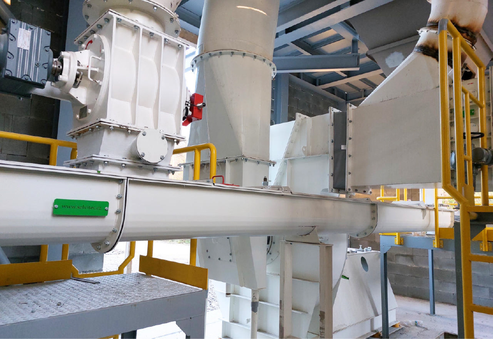 Fluidní dopravní linky, vysokotlaké ventilátory, odlučovače hrubých částic, rotační vykladače.