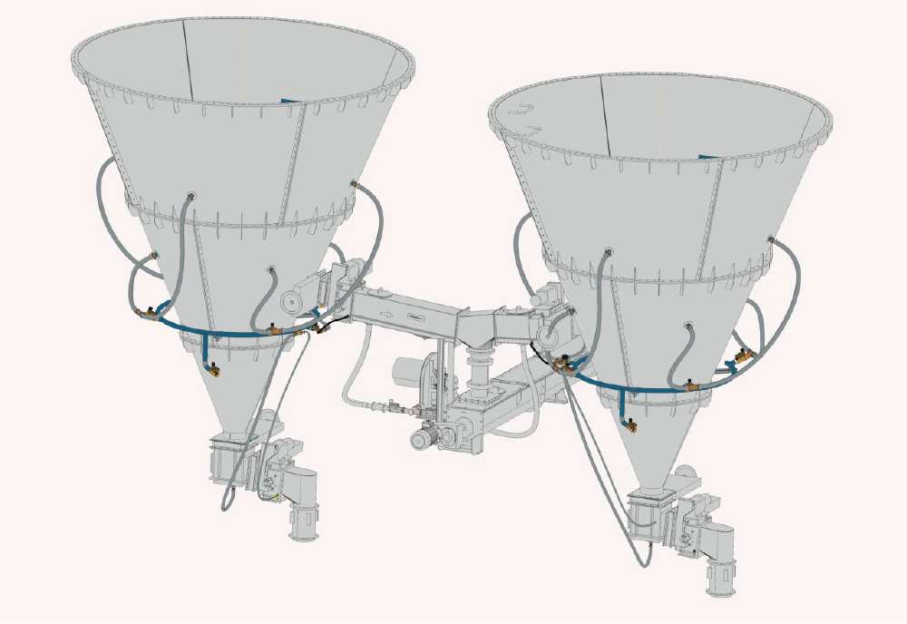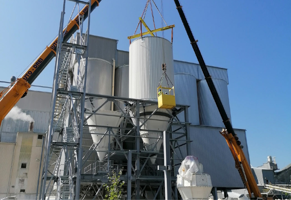 Sila a zásobníky, klapky, provzdušnění dna zásobníků, vypouštění materiálu, plnicí hubice.